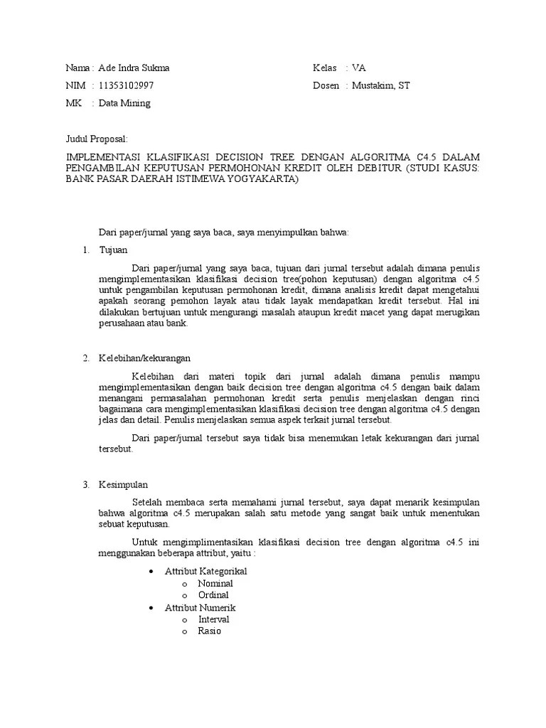 Dengan algoritma c4.5, akan didapatkan sebuah pohon keputusan yang mudah dipahami. Penerapan algoritma c4.5 untuk memprediksi kecocokan gaya belajar bagi siswa siswi sekolah dasar (studi kasus : Jumlah partisi s • pi : Penerapan algoritma c4.5 dalam pemilihan konsentrasi program studi (studi kasus di stmik widya pratama pekalongan) Penjelasan mengenai algoritma c4.5 berikut ini disertakan contoh kasus yang . Data mining, algoritma c4.5, pohon keputusan, klasifikasi, penjurusan siswa. Himpunan kasus • a : Klasifikasi penyakit tiroid menggunakan algoritma c4.5 (studi kasus : Algoritma c4.5 untuk memprediksi mahasiswa yang mengulang mata kuliah (studi kasus di amik labuhan batu) Proporsi dari si terhadap s contoh penggunaan algoritma c4.5. Menghitung jumlah kasus seluruhnya, jumlah berkeputusan "yes" maupun "no". Of disease (icd) menggunakan decision tree c4.5 (studi kasus : Menghitung entropy dari semua kasus yg terbagi berdasarkan atribut " .